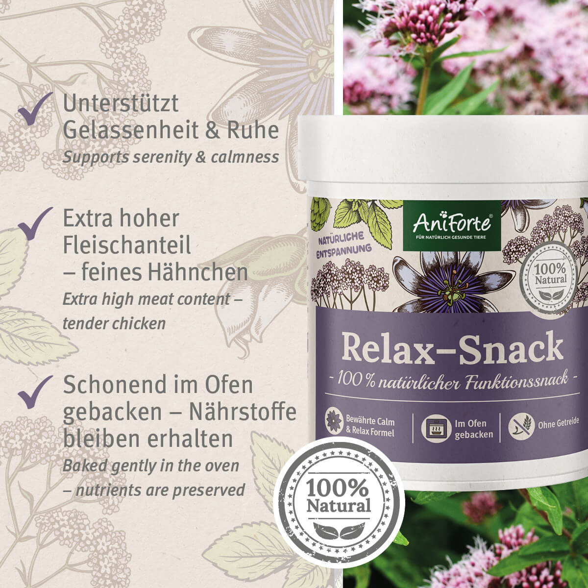 AniForte® Relax-Snacks sind eine schmackhafte und hochverdauliche Belohnung, die aufgrund des extra hohen Anteils an zartem Hähnchenfleisch besonders herzhaft im Geschmack ist. Die keksartigen Fleischsnacks sind kombiniert mit einer hochwertigen, natürlichen Kräutermischung aus Baldrianwurzel, Hopfenblätter, Melisse und Passionsblumenkraut.