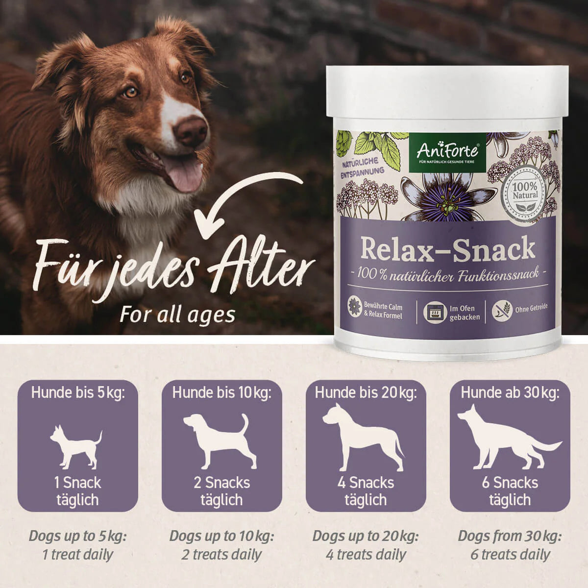 AniForte® Relax-Snacks werden besonders schonend hergestellt, damit alle Inhaltsstoffe erhalten bleiben. Dank der leichten Textur sind sie besonders handlich, passen in jede Jackentasche, krümeln und zerfallen nicht und lassen sich auch für kleine Hunde einfach mit der Hand teilen. Die weiche Konsistenz macht sie auch für Welpen und ältere Hunde zu einem perfekten Leckerli. Die Leckerlis können als Belohnung oder beim Training gegeben werden.