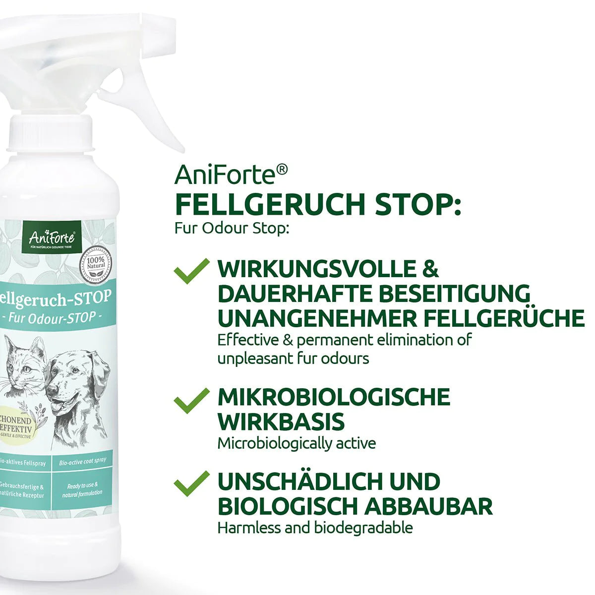 Das AniForte® Fellgeruch-STOP Fellspray wirkt tiefenwirksam durch Mikroorganismen, die unliebsame Gerüche direkt an der Basis bekämpfen und zersetzen. So wird der Gestank nicht nur überdeckt, sondern vollständig neutralisiert. Der Hund riecht nicht mehr streng und Katzenbesitzer freuen sich über wohlriechendes Katzenfell. Durch die schonenden Pflegekomponenten in Form von Arganöl, Seidenproteinen und Panthenol eignet sich die Anwendung für alle Fell- und Hauttypen – auch für besonders sensible Tiere.