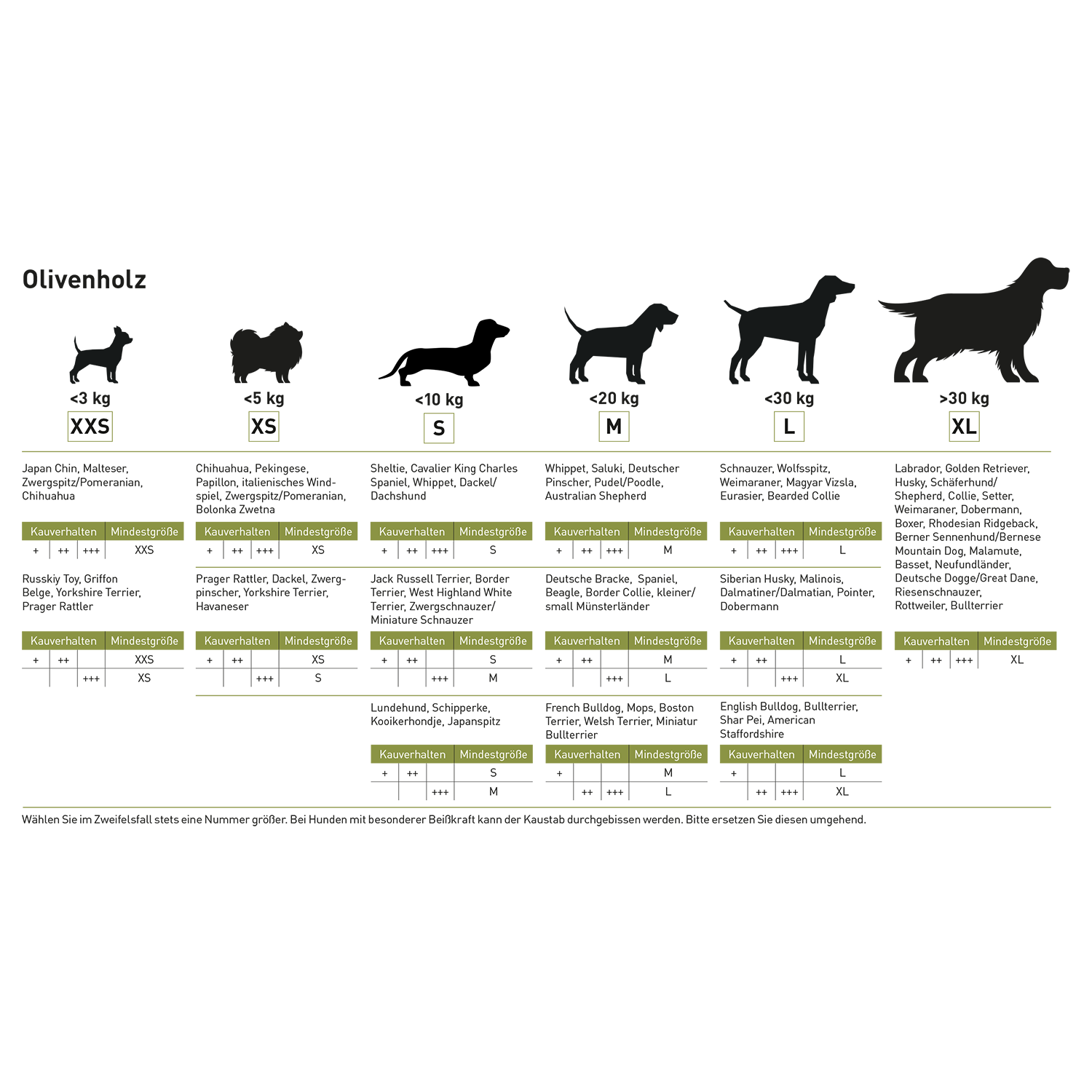 Es ist möglich, dass sehr beissstarke Hunde den Olivenholz-Kaustab zerbeissen können. Beschäftigungsspielzeug für Hunde. Nur unter Aufsicht verwenden!