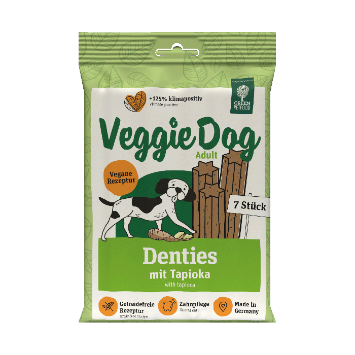 Was Zahnpflege und Weltrettung vereint? Unsere neuen Green Petfood VeggieDog Denties für Deine Fellnase! Die getreidefreien Dentasticks sind die perfekte Ergänzung zu unserem beliebten Green Petfood VeggieDog – was ihnen auch zu ihrem Namen verholfen hat. Das Besondere: Die Denties sind sogar 100 % vegan! Wir haben sie gemeinsam mit Ernährungswissenschaftler:innen und Tierärzt:innen entwickelt – in Deutschland und nur mit allerbesten Zutaten. Heraus kam ein grüner Superheld, der mit seiner sternförmigen Struktur das Kauen fördert und sich dank Cellulose hervorragend zur Unterstützung der täglichen Zahnhygiene eignet – Zahnfleischmassage inklusive! Da wir hier komplett auf Fleisch verzichten und stattdessen auf schmackhafte Tapioka setzen, ist jeder Denti ein grünes Wunder, das Zähne pflegt und gleichzeitig auch für Sensibelchen verträglich ist. Bereit, die Welt UND die Zähne Deines Vierbeiners zu retten?