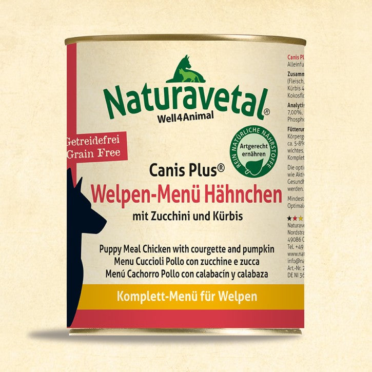 Leichtverdauliche Rezeptur: Hähnchenfleisch ist eine leicht verdauliche Fleischquelle, die für alle Welpen gut geeignet ist. Auch magenempfindliche Hunde vertragen unser Welpen-Menü Hähnchen sehr gut. Zudem kann es als Ersatz für selbst zubereitete Schonkost dienen.