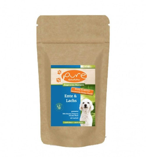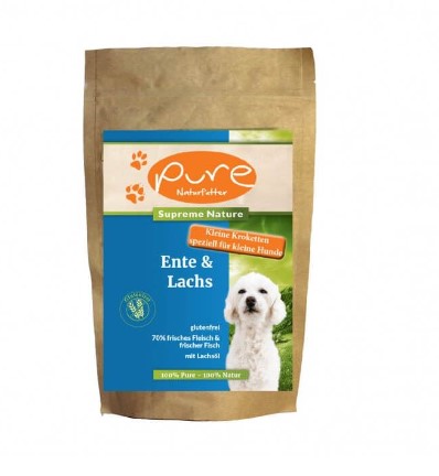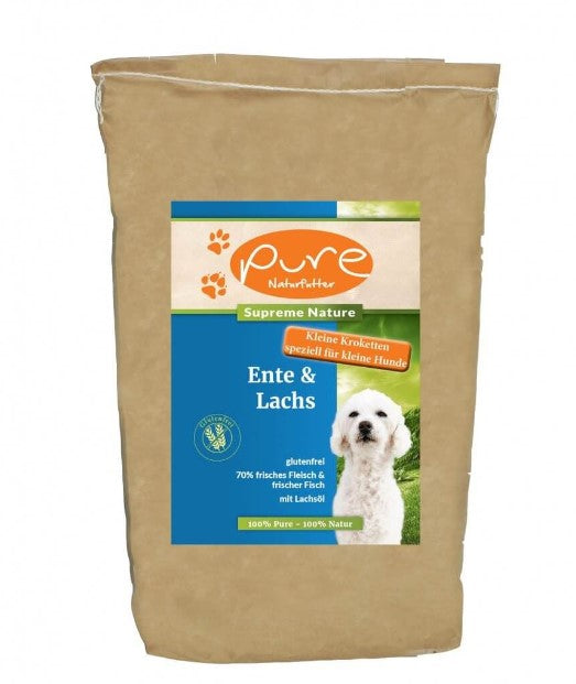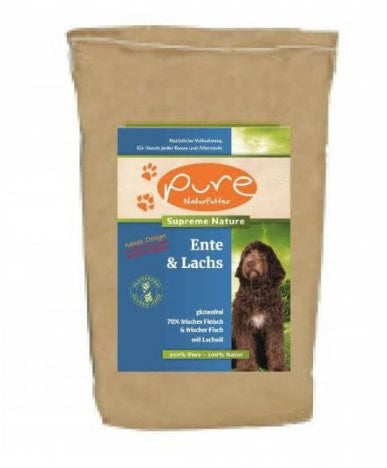 PURE Supreme Natur Ente & Lachs besteht aus ausgesuchten, hochwertigen und naturbelassenen Rohstoffen. Das Trockenfutter bietet Ihrem Hund all die Vielfalt und Unverfälschtheit, die nur ein vollständig naturbelassenes Hundefutter leisten kann.